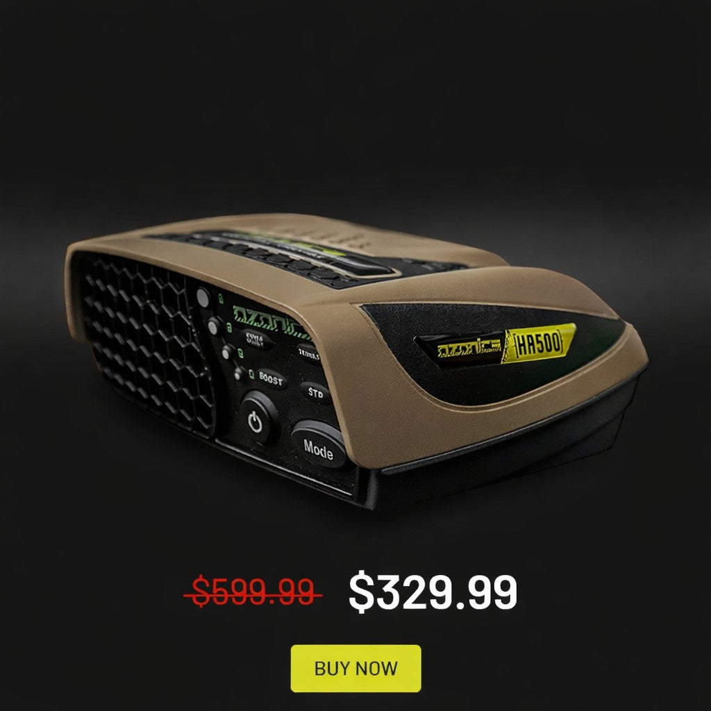 HR500 Value Pack featuring a black and tan handheld device with multiple buttons and a digital screen, alongside a smartphone displaying the compatible app with navigation and status indicators