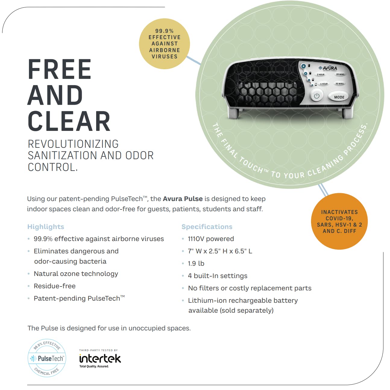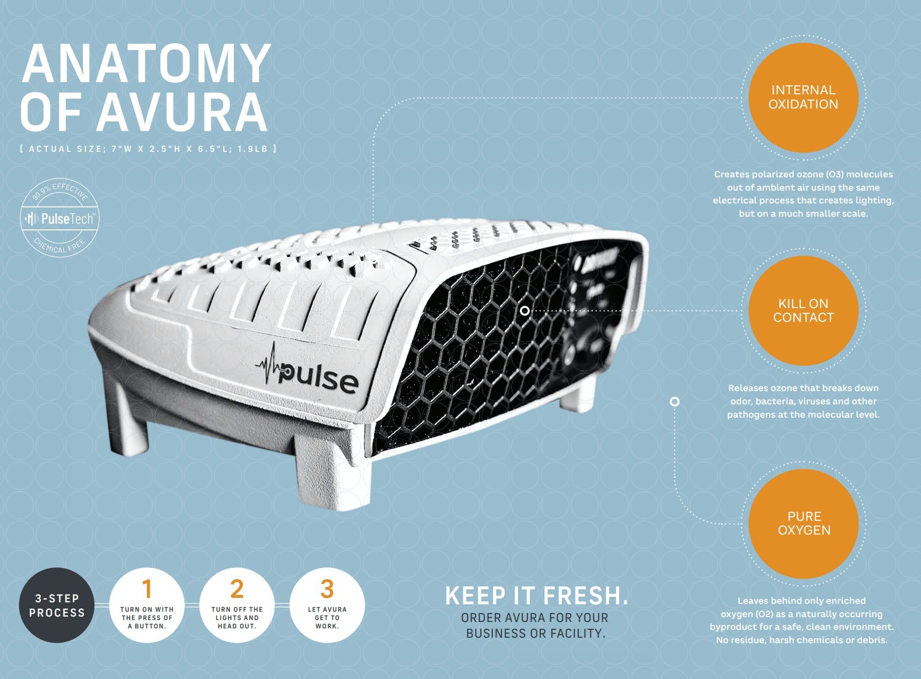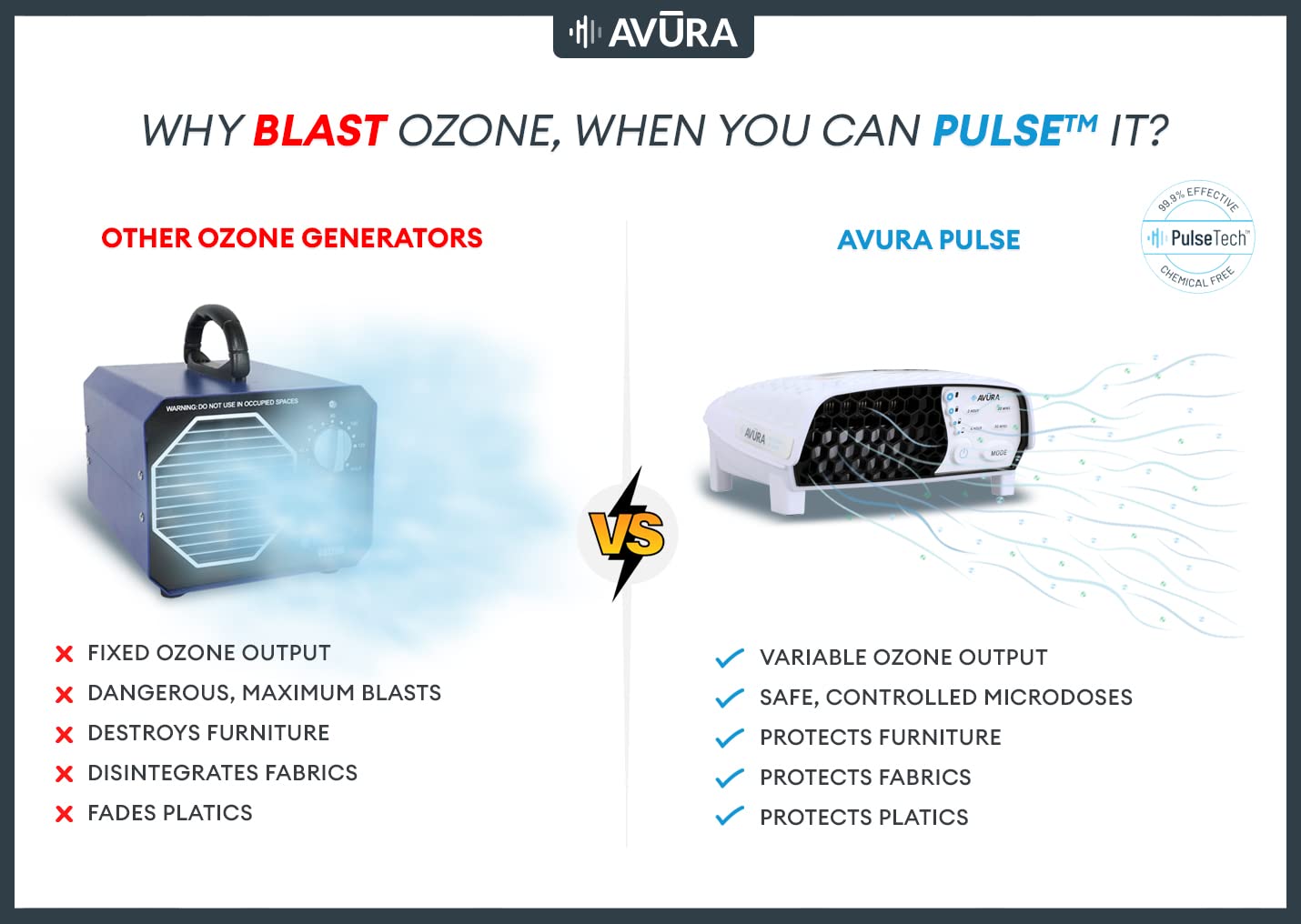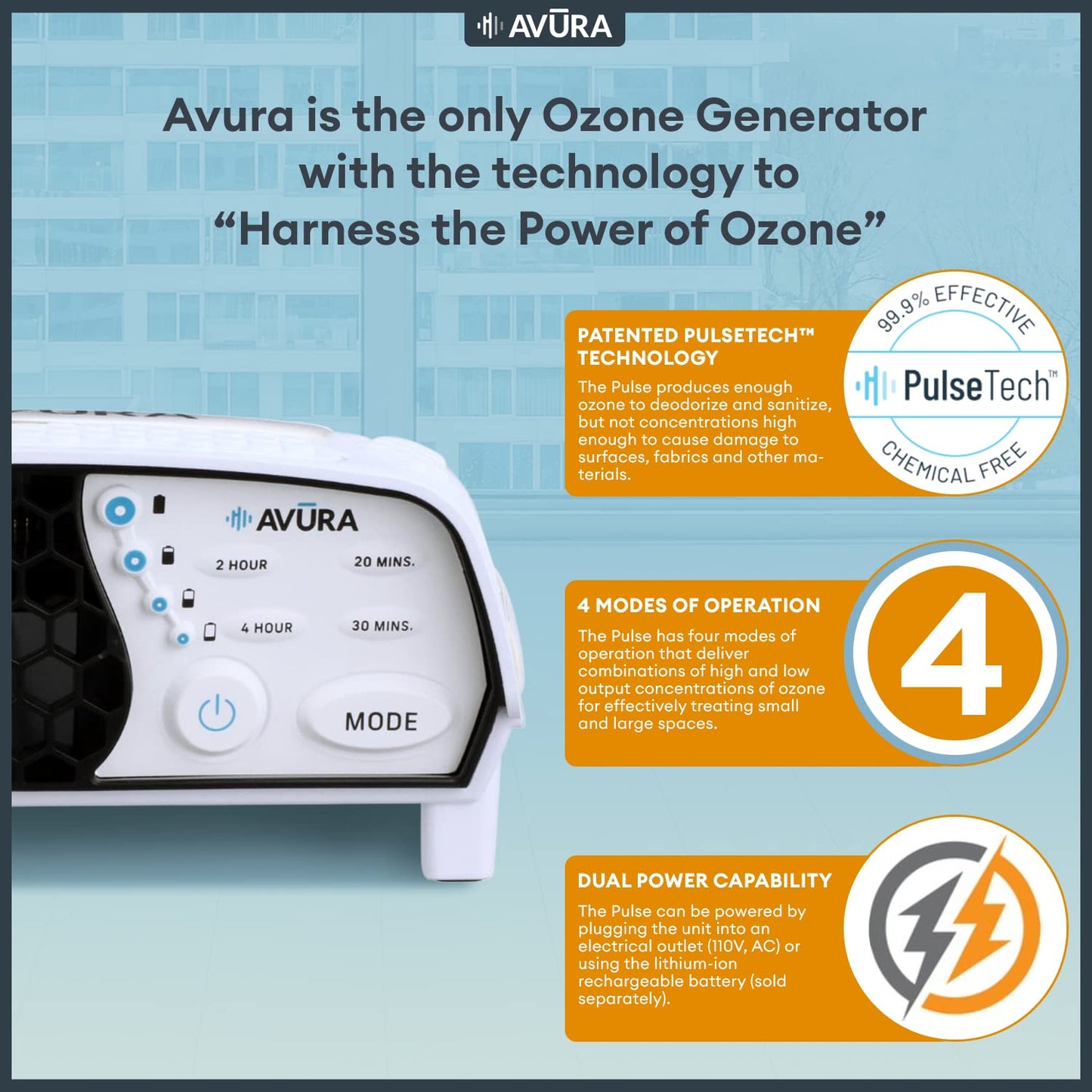 The Avura Pulse features a patented technology that delivers safe concentrations of ozone into the air in short, controlled durations to